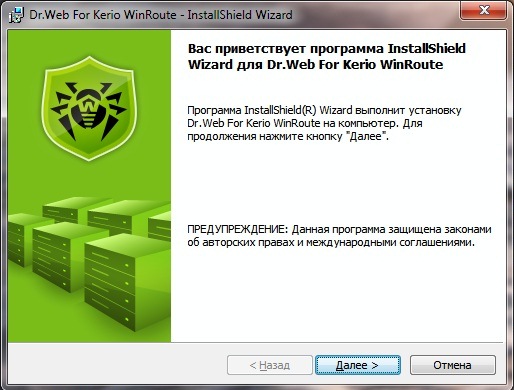 Для интеграции в продукты Kerio в качестве внешнего антивирусного плагина компания DrWEB пошла нетрадиционным путем - она создала отдельные программные продукт под названиями DrWeb for Kerio WinRoute и DrWeb for Kerio Mailserver. Продукты эти представляют собой стандартный сканер DrWEB с отсутствующим интерфейсом управления и ограниченными функциями. Как и все продукты DrWEB эти плагины требуют отдельной лицензии, в отличие от большинства аналогов лицензия требуется даже для установки этого плагина. Лицензию ищем в Интернете... Установка программы не вызывает особых сложностей. Рассмотри на примере DrWeb for Kerio WinRoute . Лицензию мы нашли :), теперь скачаем сам продукт отсюда: DrWeb for Kerio WinRoute и запустим инсталлер.
