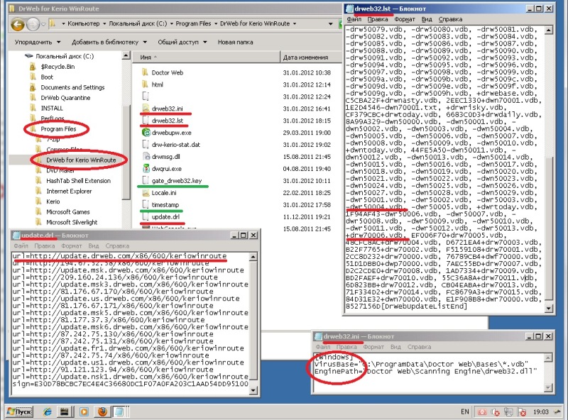 Обновление плагина DrWEB производится планировщика заданий ОС (служба планировщика должна быть включена, задание создается во время установки плагина и выполняется от имени ОС) и не зависит от обновления основного антивируса. Частота выхода обновлений - два-три раза в сутки, но отсутствие обновлений в течение трех-пяти суток есть нормальное явление. Для проверки работы установленного плагина можно сравнить содержание дебаг-лога с этим образцом - TXT/debug.log.txt, проверка логов для остальных антивирусов может быть проведена сравнением с этими образцами - Gene Office - Kerio Antivirus. Обновление антивирусных баз плагина можно проводить вручную. Для этого скачиваются все архивы отсюда, распаковываются и полученными файлами замещаются все существующие файлы антивирусной базы с удалением предыдущей версии файлов. Плагин будет работать до окончания срока лицензии, после чего файл с лицензией следует заменить на актуальный. Файл лицензии можно редактировать - как, это отдельный вопрос...