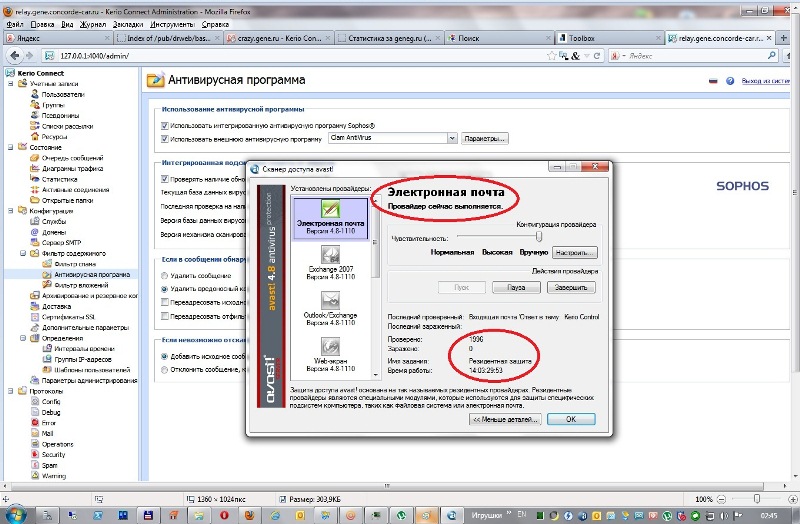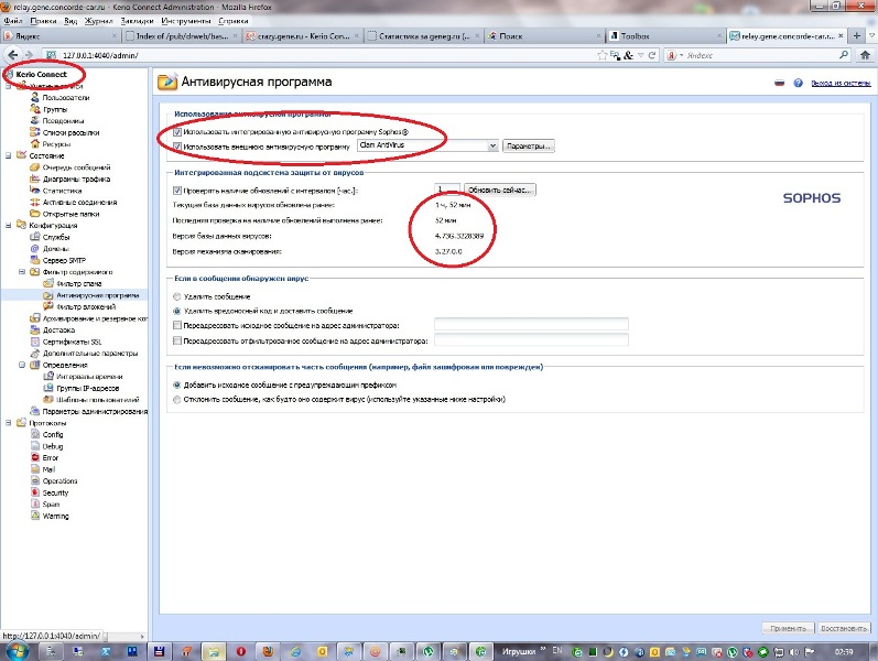 В Kerio Connect оставим встроенный антивирус Sophos и в качестве внешнего плагина используем антивирус Clam -- как см. здесь.