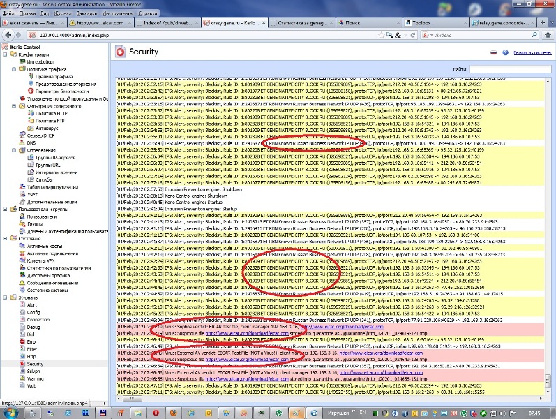 Проверяем работу плагина в паре с встроенным антивирусом и самостоятельно. Скачиваем EICAR и пару настоящих вирусов, потом смотрим журнал безопасности. Все успешно: