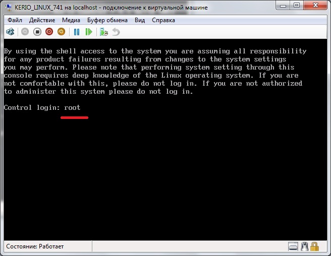 Нажмем Alt+F2 и войдем в ОС как root. Пароль - тот же самый, который был установлен в Керио для пользователя admin.