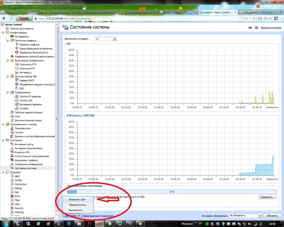 Исключительно для наглядности (это можно сделать и в командной строке консоли) - откроем страницу "Состояние системы" и, удерживая нажатым правый Shift, мышкой откроем меню "Действия", а там выберем - включить SSH. Если кому в новинку - SSH это аналог командной строки для удаленного управления ОС по сети. Нам эта возможность потребуется для обмена файлами между ОС Керио и внешними хостами - передать в керио патч, например.
