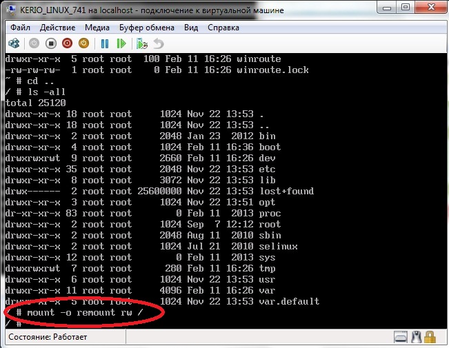 По умолчанию файловая система имеет установки "Только для чтения". Перемонтируем ее для того, чтобы иметь возможность записи файлов. Обратите внимание на прямой слеш в конце команды.