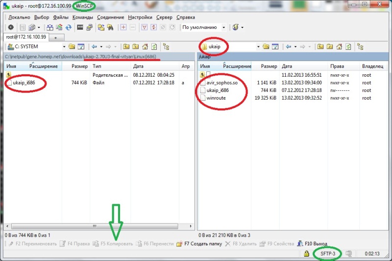 Cкачиваем из Инета и инсталлируем программу WinSCP - это графическая оболочка над протоколом передачи файлов по сети, использующем SSH. Подключаемся к внутреннему интерфейсу Керио, вводя имя root и пароль админа. Копируем в директорию UKAIP файл ukaip_i686 из состава пакета UKAIP. Только после этого останавливаем демон винрута из консоли командой /etc/boxinit.d/60winroute stop