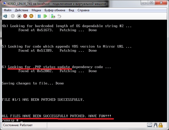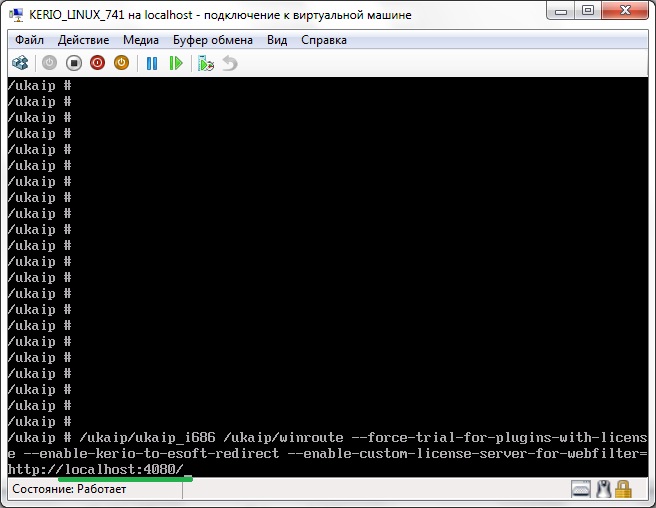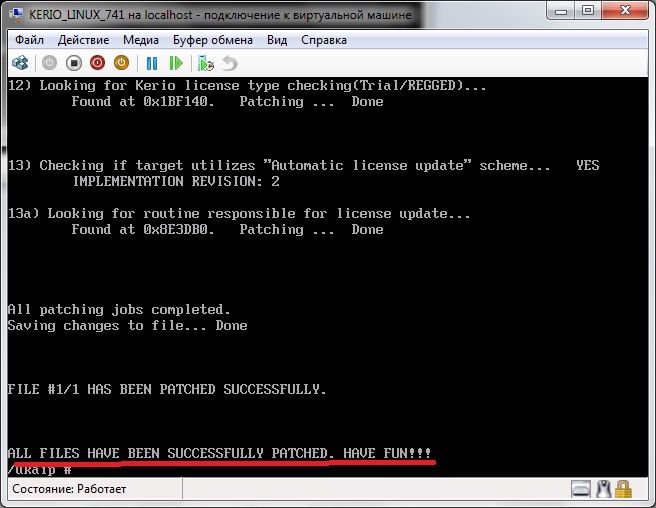 Потренировавшись несколько раз в создании разных комбинаций патченых файлов Керио и сохранив результаты для дальнейших тестов, проведем боевой патч. Перенесем нашу рабочую директорю в /var, восстановим натуральные файлы керио из сохраненной копии, создадим сайл path.cmd с правами 700, поместим в него следующие команды: mount -o remount rw / /var/ukaip/ukaip_i686 /var/ukaip/winroute --force-trial-for-plugins-with-license --enable-kerio-to-esoft-redirect --enable-custom-license-server-for-webfilter=http://updater/ -E 123456/12345167890 /var/ukaip/ukaip_i686 /var/ukaip/avir_sophos.so