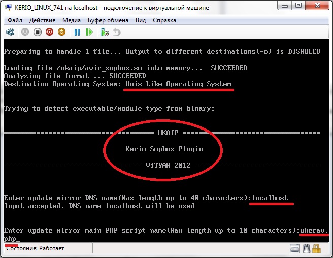 Переходим в патчу антивируса. Здесь аналогичная ситуация - не надо использовать имя localhost !!! Правильно будет так: /ukaip/ukaip_i686 /ukaip/avir_sophos.so -Ss updater Имя файла конфигурации сервера обновлений Софоса настоятельно рекомендую вводить вручную, а не в скрипте. В данном случае использовано имя ukerav.php