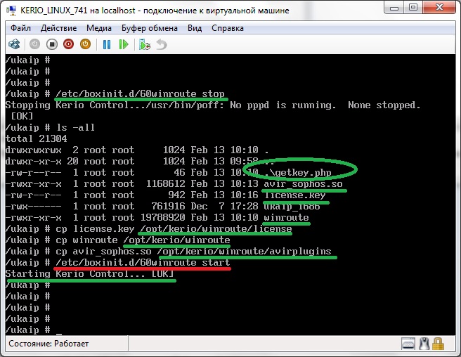 отметим попутно, что патч генерирует файл getkey.php с ошибкой в названии. Нам это безразлично - этот файл мы использовать никогда не будем и спокойно его удалим. А полученный файл лицензии и пропатченные файлы winroute и avir_sophos.so разложим по своим законным местам, заменив ими исходные (копии которых остались в директории BACKUP) файлы: