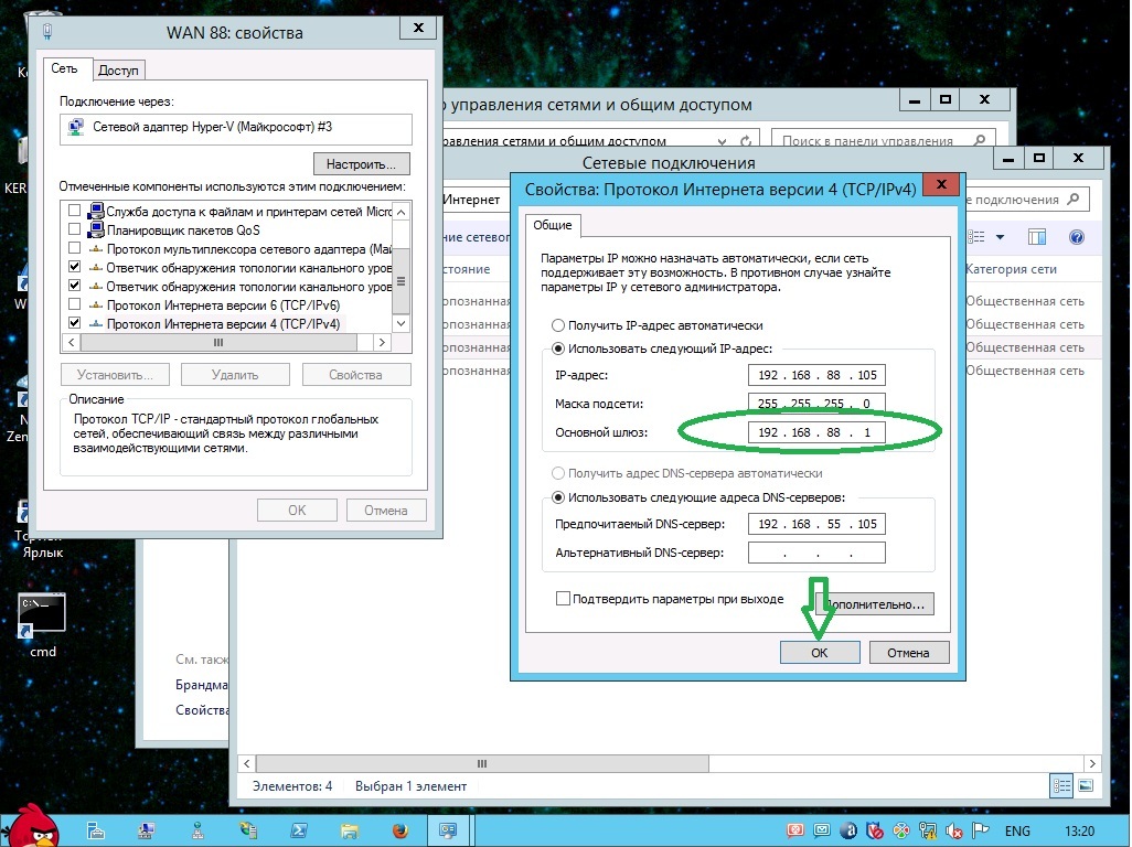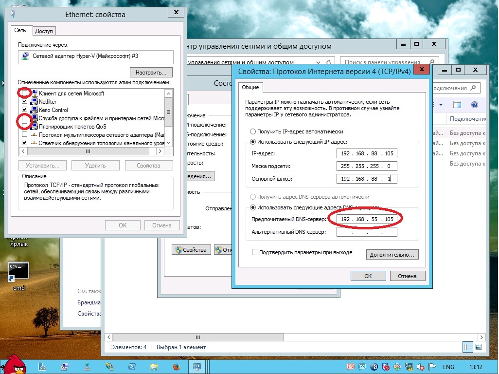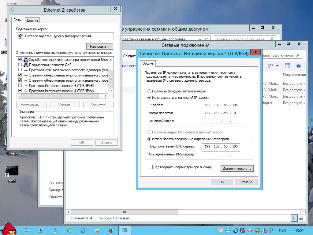 Ориентируясь по именам адаптеров устанавливаем вручную необходимые параметры сети. ДНС указывем на адрес этого же интерфейса: