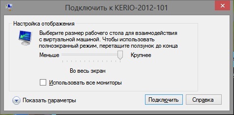 Это новшество Hyper-V в Windows 2012 R2 - работа с виртуальной машиной по протоколу RDP, если он поддерживается гостевой операционной системой. KW2012 такую возможность поддерживает. Это большой плюс для админа - скорость работы и качество экрана даже без включения виртуализации видеокарты VirtyalFX просто в разы выше, чем при обычном подключении. Вот наш рабочий стол: