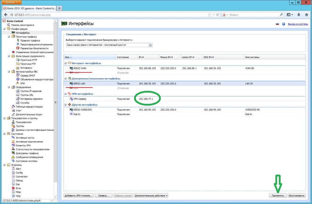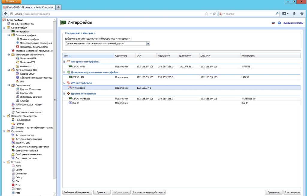 Откроем консоль администрирования Kerio Control и отредактируем параметры интерфейсов. Поскольку в исходной виртуальной машине присутствовали сетевые интерфейсы, то в консоли они отобразятся как несуществующие. Это лень автора, а не проблема, потому спокойно удаляем эти призраки и даем вменяемые имена новым интерфейсам. Обратим внимание на присвоение адресов VPN-серверу - определим нужный диапазон адресов и ДНС-сервер.