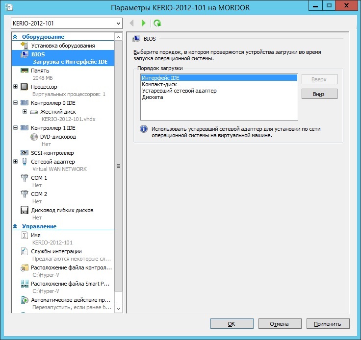 Открываем параметры созданной виртуальной машины. Сразу меняем вариант загрузки на интерфейс IDE: